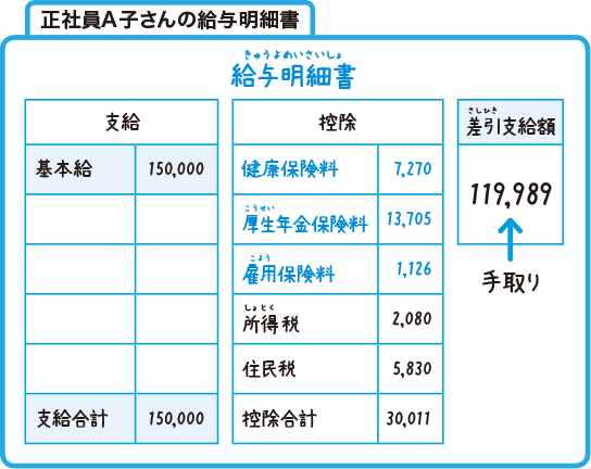 「月給15万円=毎月15万円もらえる」と思ってはいけません。会社は「基本給」としてあなたに15万円を支給しきゅうしますが、そこから「控除」とよばれるものが自動的に引かれるので、実際にあなたがもらえるのは15万円よりも少ない金額になります。実際にもらえるお金を「手取てどり」といい、この手取りの金額で、あなたはひとり暮らしをしていくことになります。