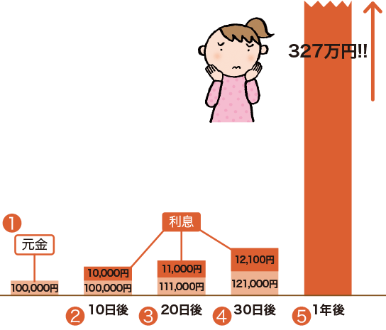 - ❸20日後には10万円+利息が「元金」になってそれに利息がつく