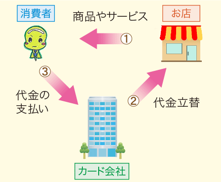 ②カード会社は、①の代金をお店に立て替えばらいしているんだ。